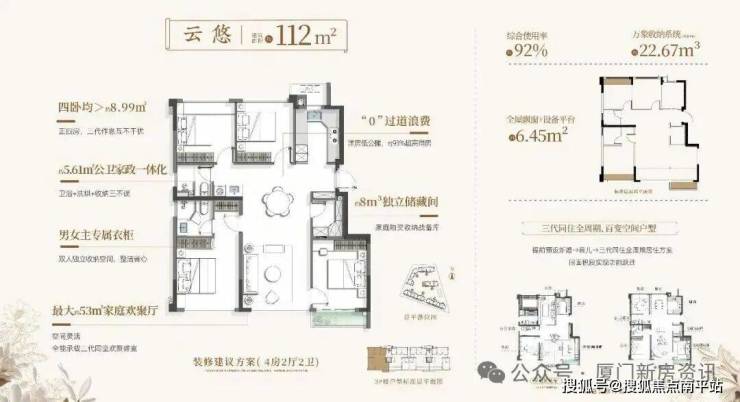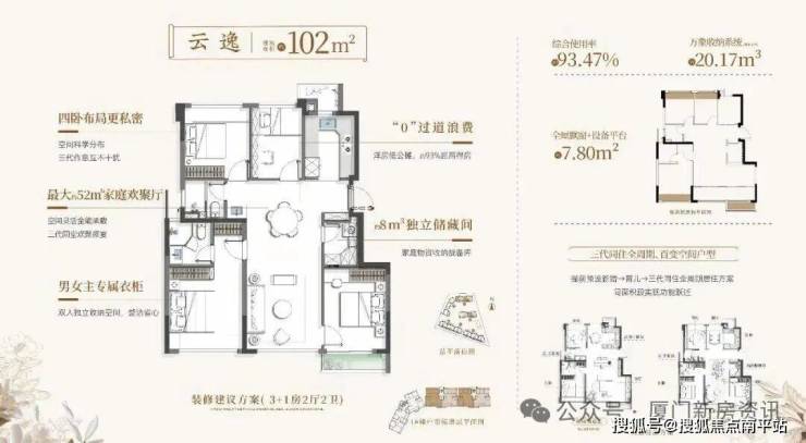 作为一处纯粹洋房社区,建发璞云仅规划6—10层低密建筑,共195套房源。 面积从70㎡延伸至113㎡,均价约4.8万/㎡ ,部分高性价比楼层更具吸引力。全系一梯两户、南北通透,得房率突破90%,岛内首创的万象收纳系统,结合架空层泛会所与空中花园,重构了小户型的空间想象。