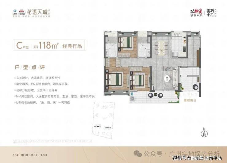 约118㎡3+1多功能空间,入户带玄关,增加居住私密性,兼顾居住舒适性与功能性的平衡,南北通透,约7米景观阳台连接客厅。