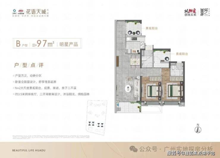 约97㎡2+2多功能空间,同等面积多一间房,超85%使用率,双静动分离格局,独处互动两不误。