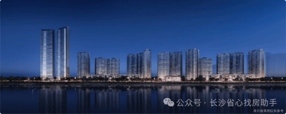 以湘江为灵感,演绎"星钻水波"美学,搭配铝板装饰、蓝白相间的色彩体系,镜映湘江壮阔。约26.5度的建筑侧斜姿态,让南北视野更大化瞰江。