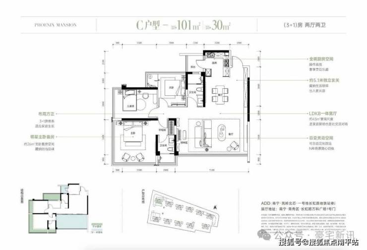 ▋升级首选:建筑面积约101㎡ 3+1房两厅两卫 可拓展面积约30平米 得房率约116%