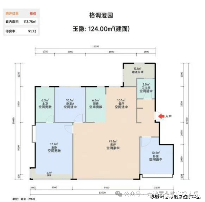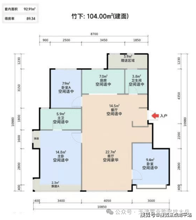 104㎡三居:南北通透,动静分区合理,主卧面宽3.4米,但北侧卧室略显紧凑(面宽2.5米),适合预算有限的刚改家庭。