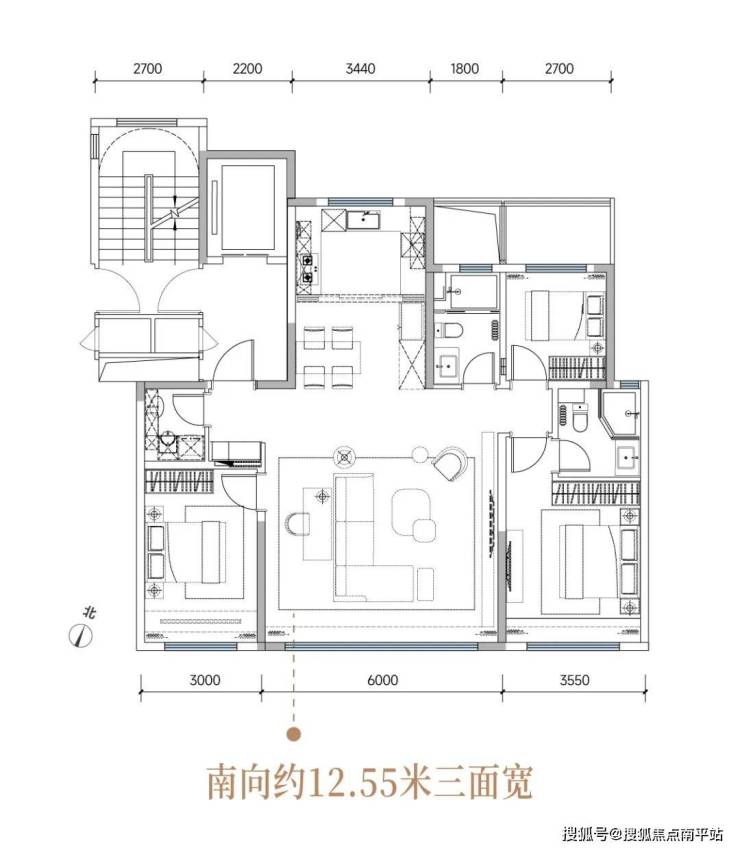 约12.55m南向三面宽设计,让清晨的阳光照亮每个角落,独立电梯厅的存在,让回家的第一眼就是温暖相迎。