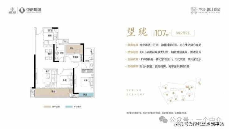 约107㎡户型:三房两卫设计,全明户型,客厅与阳台和南向次卧间无承重墙体,可改造成超大尺度客厅