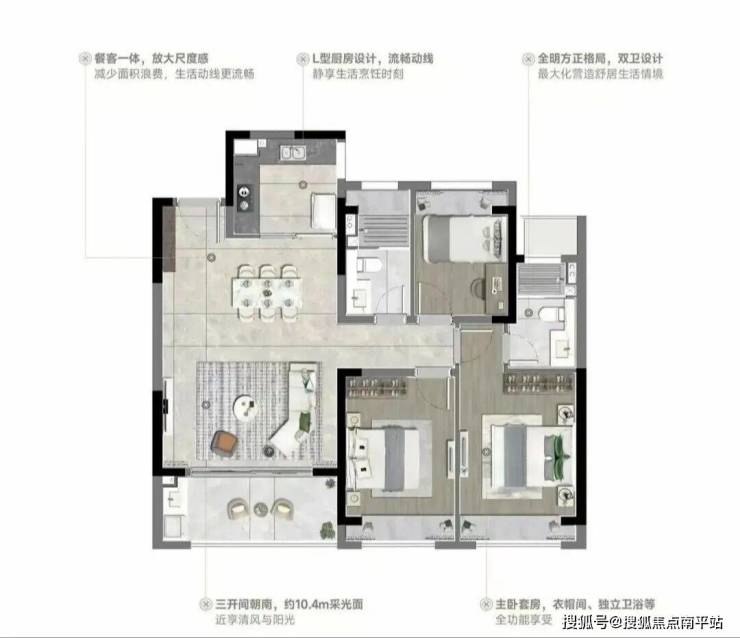 星樾湖滨这款户型三开间朝南,采光面达10.4米,餐客一体设计减少面积浪费,L型厨房动线流畅,双卫配置满足多口之家使用需求,无论是三口之家还是年轻夫妻首置,都能一步到位。