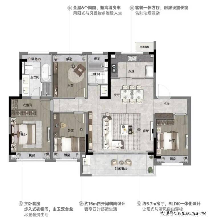 卧室尺寸充裕,主卧“星级套房”,自带步入式衣帽间+主卫双台盆+浴缸,关上门就是“独立小世界”。即便是次卧、书房,也能轻松放下大床+衣柜;加上全屋6个飘窗“拓展”,空间利用率与舒适感双双拉满。