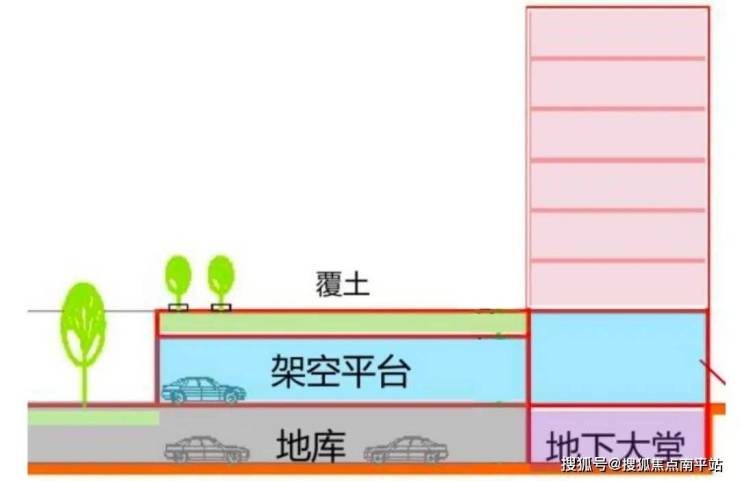 人、车行入口天然分离,车辆在架空平台下穿行、停泊,人在平台顶漫步,这是最佳的人车分流。车行入口融入架空平台边界,形成一体化门头,这样开车归家也能享受到和步行归家一样的仪式感。