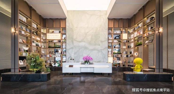 社区归家大堂也是书吧,近5.8米的室内净高营造出进入博物馆般的仪式感。接待台背后,以通高的青玉奢石背景墙营造第一记忆点。