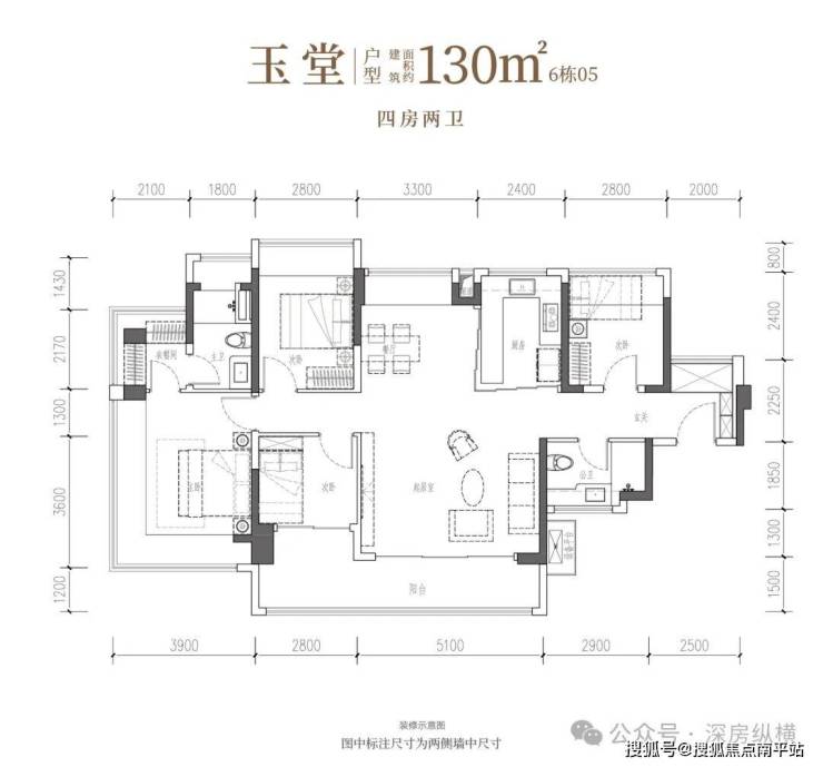 ▲玉堂·建面约130㎡4房2厅2卫:南向四开间,约14.7米IMAX光幕,尺度自成。