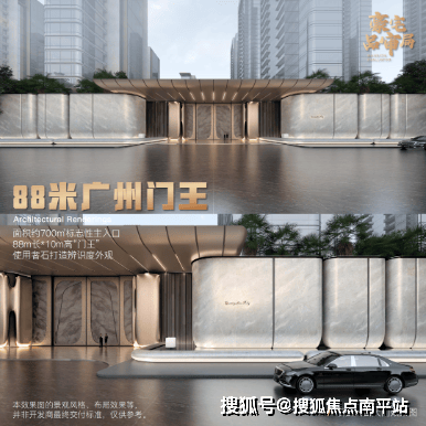 不仅如此,立面设计采用大面积玻璃幕墙与金属铝板材质,形成流动感与光影效果交织的视觉语言,建筑气质沉稳而不失先锋,营造出“国际化+都市雅奢”的高识别度立面效果。项目主入口更是以88米门面宽、10米通高的“门王”姿态,成为广州门面级封面之作。