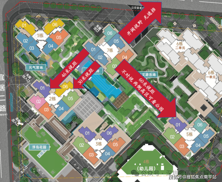03、04户型视距更远,达到60米,可以全景看中央园林景观。05、06户型视野最佳,享受无遮挡辽阔城市景观。
