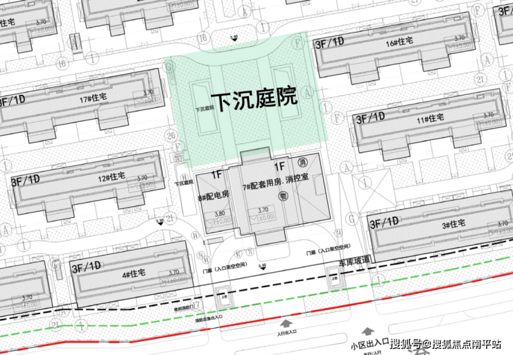 项目整体布局呈现南低北高布局,三个小区出入口、两个人行出入口,其中南大门作为主出入口设置了下沉式庭院,预计未来作为会所配套使用。