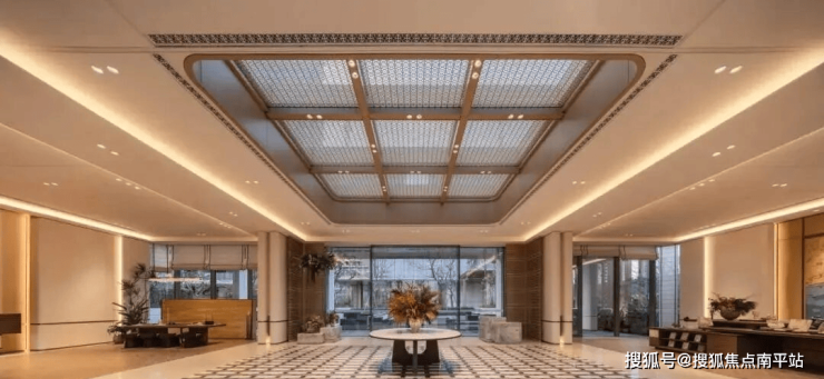 建筑立面:采用大面积玻璃幕墙,细节处点缀香槟色格栅,简约大气。灵感来源于游艇线条,呈现出“流线型”的柔和曲面,消弭了建筑与自然之间的割裂。