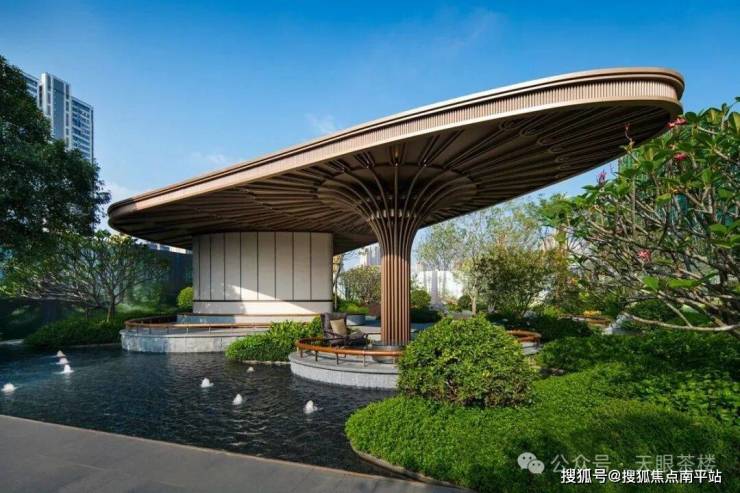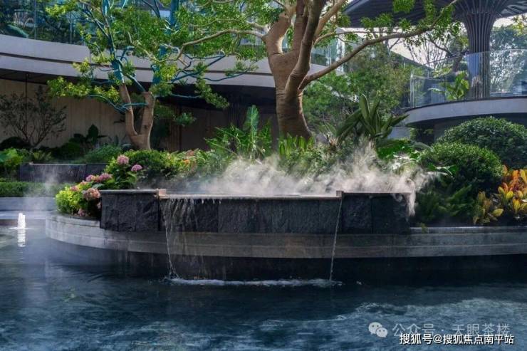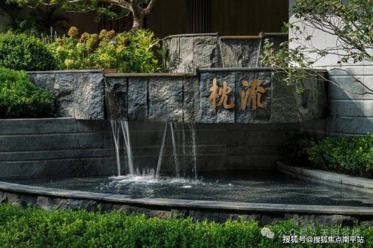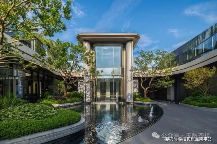 来到国贸学府锦樾社区大门前场,大门前场主景池能看到“三级台阶”、“十二涌泉”,还有两边高大的朴树,都蕴含平安顺遂之意。