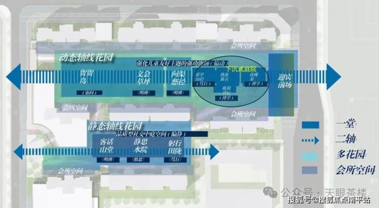 然后就来到了下沉式庭院。国贸学府锦樾社区中庭动线采用“一堂、二轴、多花园”组成,围绕着白鹿洞书院著名的“贯道溪”这个线索展开。下沉式庭院在图中【洗砚泉、枕流漱石、鹿洞讲坛、求学山径】区域。