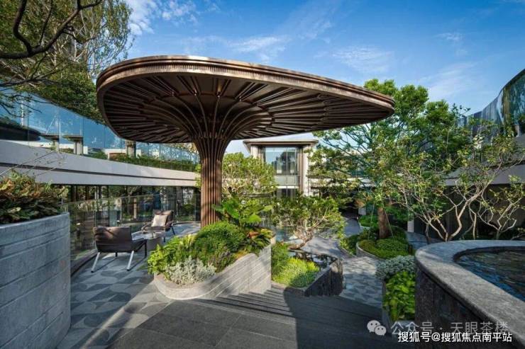 从石阶走上来或电梯厅直接上来,就到了社区花园中庭地面,首入眼帘的是桂苑闲庭,依然呼应白鹿洞书院。