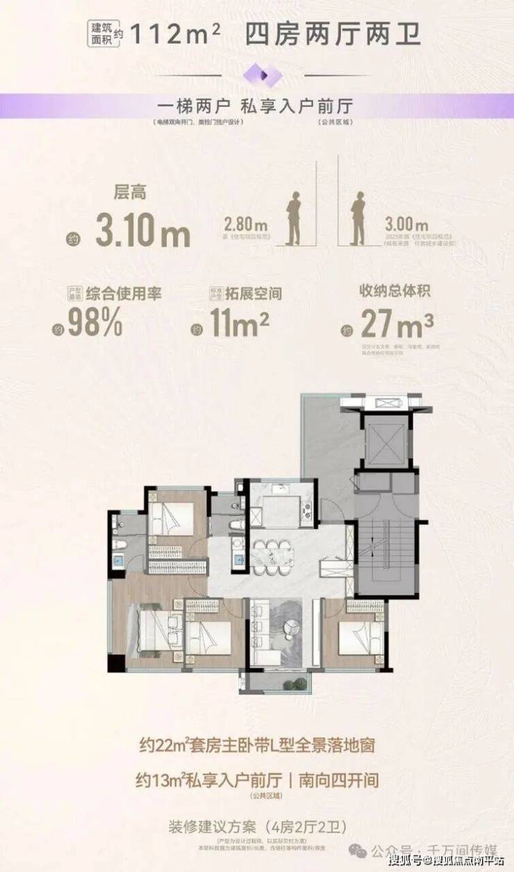 ·95-112㎡洋房:95㎡总价480多万,综合使用率97%;112㎡折后总价560 多万,综合使用率98%;户户带约13 ㎡电梯前厅,2-5层带6-9㎡晒台,是思明区唯一在售洋房!