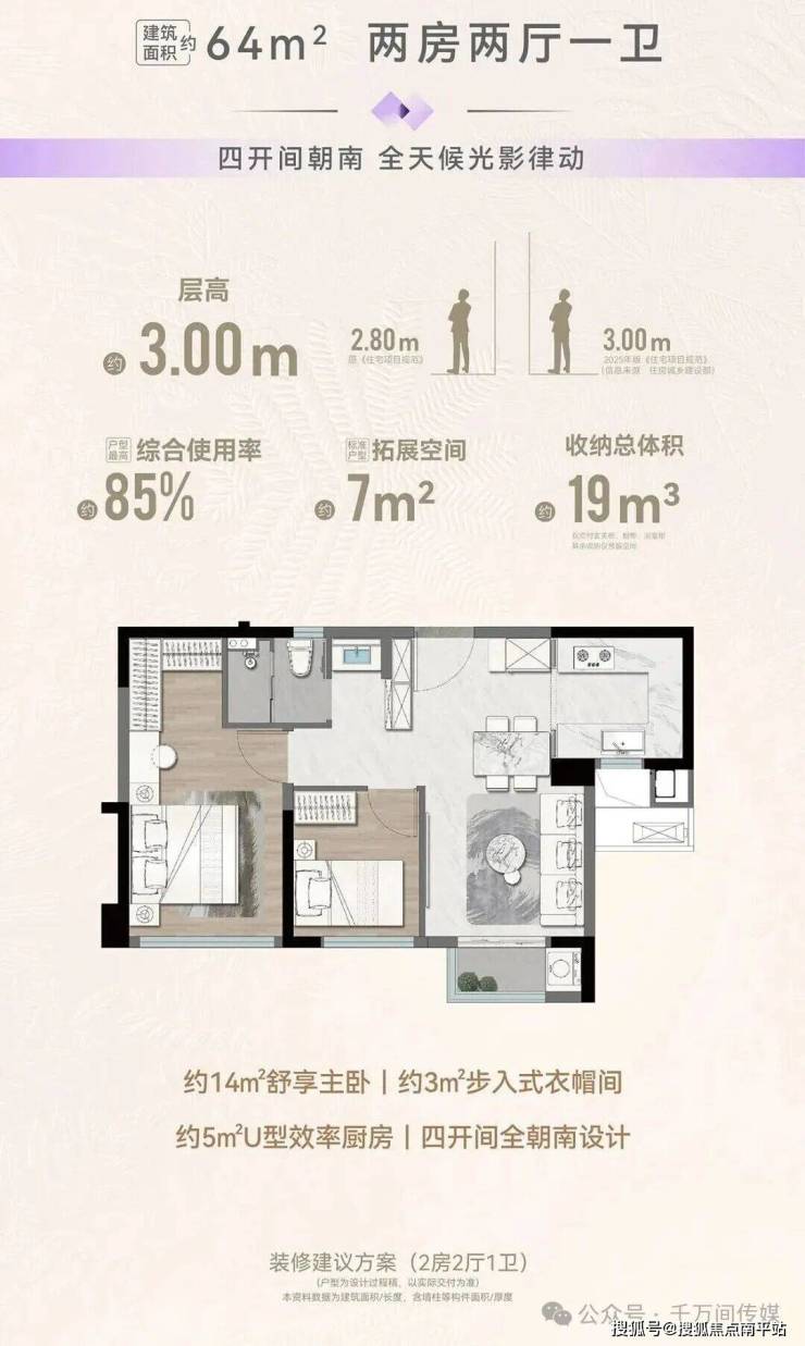 ·64㎡两房:首开的7#楼 仅30套,层高3米,综合使用率85%,使用面积相当于目前市场上75㎡的户型,客厅卧室全朝南,主卧14㎡带衣帽间,华为鸿蒙智慧+顶配精装。总价折后290万起,基本是岛内新房最低门槛!