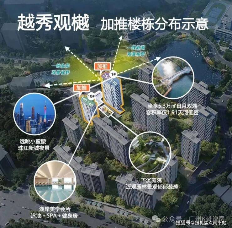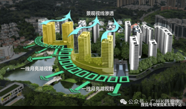4,景观不错,45-52米的低密度小高层,按照“前低后高”的建筑高度控制,形成朝向湖区梯级跌落的设计,大地块西北向望湖景,小地块西向往湖景。