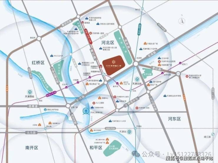 「教育」:新建九年一贯制学校并引入优质资源(育婴里教育集团+市五所),外部包括育婴里小学、津五十七中学、昆纬路第一小学、天津外国语大学附属外国语学校、扶轮中学、天津市第二中学、天津市第十四中学、天泰路小学、天津外国语学校南普小学、河北工业大学附属红桥小学、北马路小学、天津市河北区中心小学、天津外国语学校、天津市第三十五中学、天津市美术中学、天津市第八十九中学