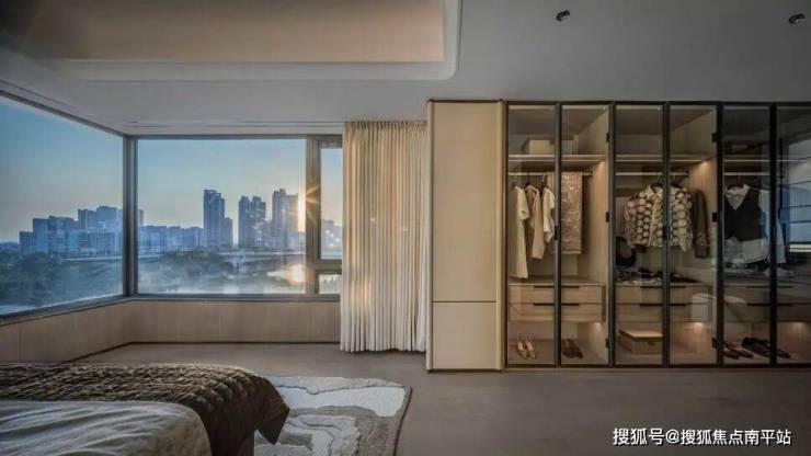 ✅约38.5㎡高奢主卧,标配独立衣帽间,更以L型飘窗270°环幕视野,将江色天光框成四季流转的艺术画作。