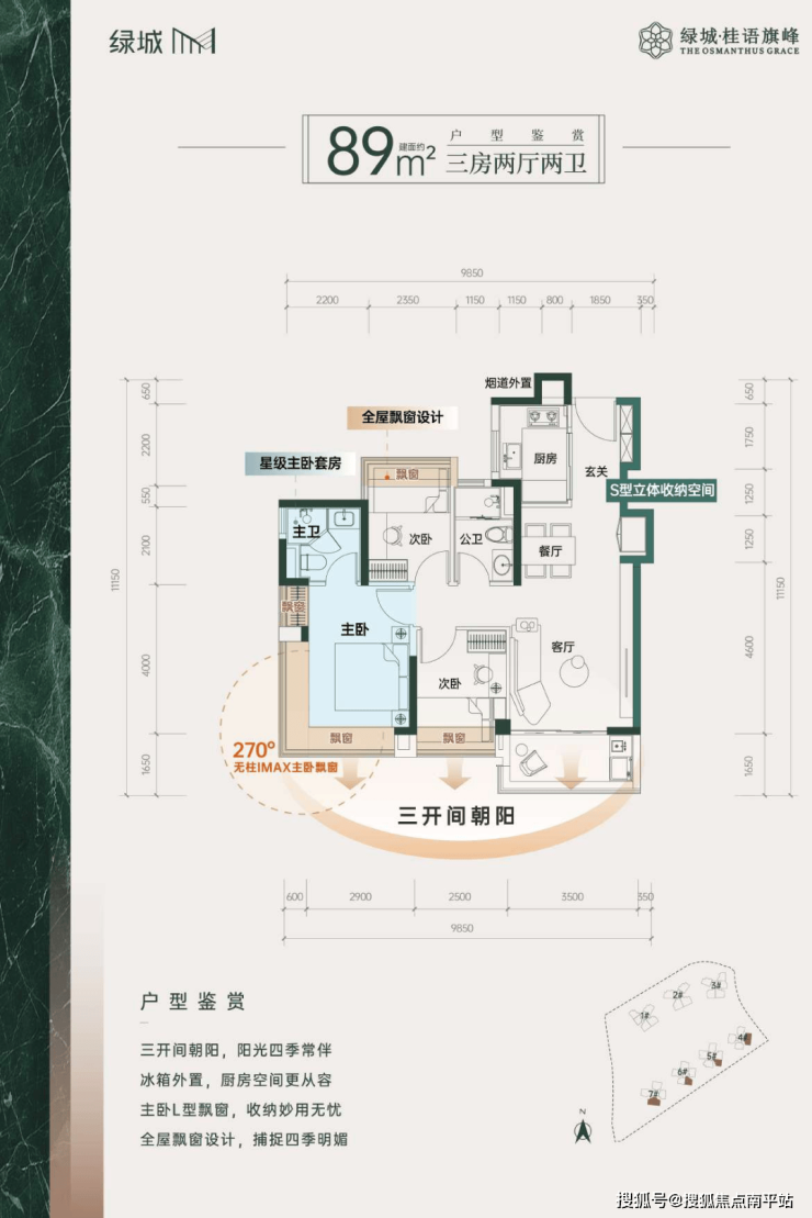 首先是89㎡三房,整体户型方正,不浪费面积,设计取巧,使用率超过91%。