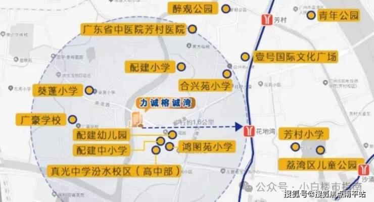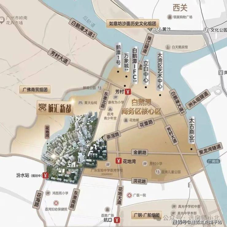 力诚榕诚湾属于茶滘旧改项目,位于荔湾花地河以西,广州香料厂以南地段,北侧有一座高架桥,东邻汾水花园和真光中学,西侧为芳村的花地河。