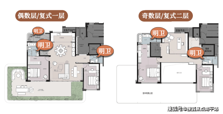 两大户型借力立体生态住宅政策红利,通过空中花园大面积赠送,得房率都达到了约100%,实现较传统住宅的突破性进阶。