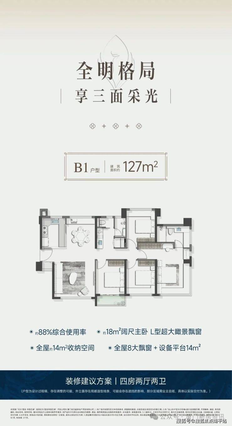 127㎡户型:得房率达到88%,18㎡主卧270°IMAX观景视野,无柱设计,实际使用空间能对标传统140㎡户型,全屋八大飘窗+设备平台14㎡