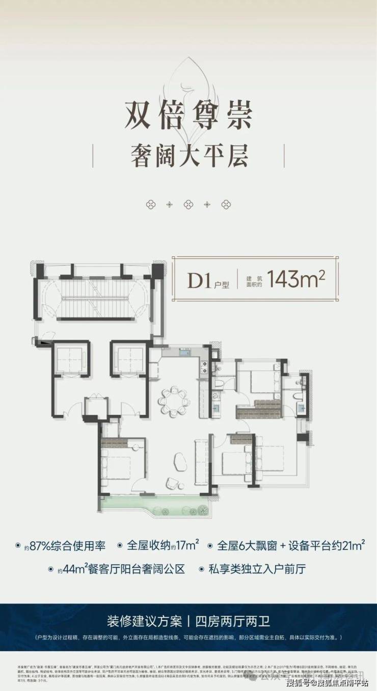 143㎡户型:两梯两户独立门厅(约3.75米独属收纳空间),7.4米外阳台,全屋飘窗阳台约21㎡,多套卧设计,揽中庭。