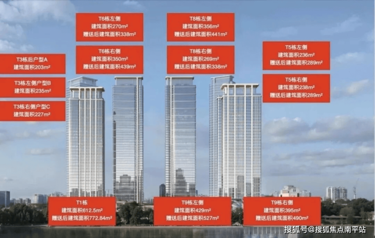 产品分布如下:1#,35层高,只有一个面积段,约630㎡户型;3#,50层高,约205-236㎡户型;5#,50层高,约236-240㎡户型;6#,49层高,约270-350㎡户型;8#,49层高,约270-350㎡户型;9#,37层高,约377-405㎡户型。1#和9#承担最大面积,所以一线头排望江;6#和8#面积段其次,因此位置稍微靠后,但也能做到垂直望江;1#和5#是200+平专场,视线就需要避让头排,斜出江景。