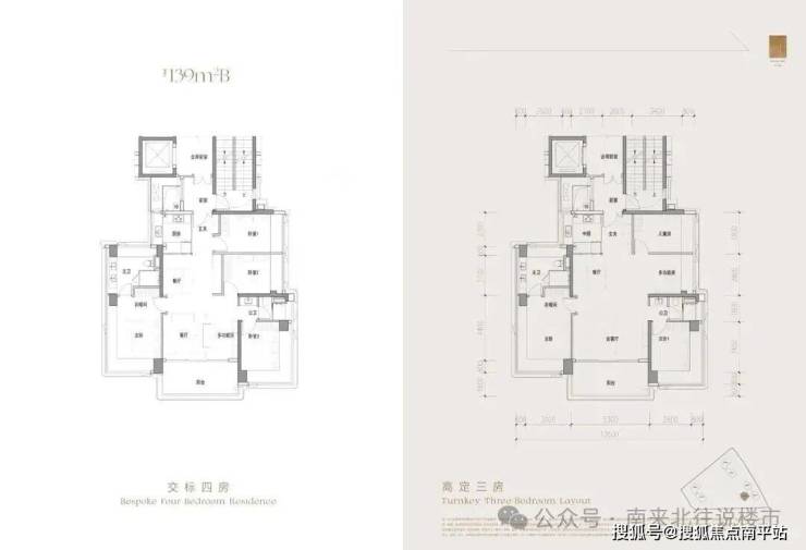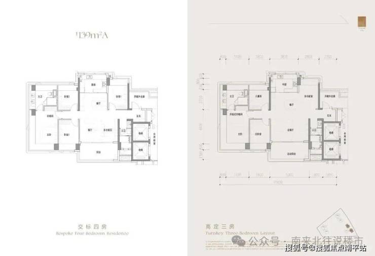 139㎡四房两厅两卫 :位于3栋,提供A(竖厅南北通透)、B(双龙抱珠)两种格局。四开间朝南设计,主卧配备270°无柱转角飘窗。由SCD团队打造,提供“风尚米”和“经典灰”两种装修风格,可定制为高配版三房。