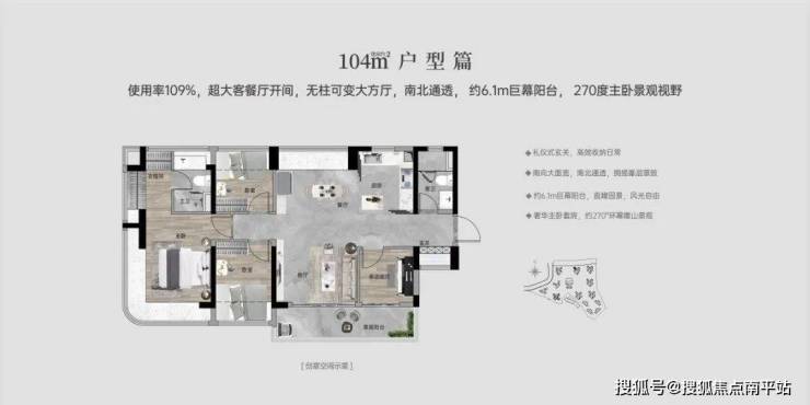 【100㎡四房两厅两卫】:西南向,使用率109%,南北通透,约6.1米巨幕阳台,主卧270°主卧弧形玻璃幕窗。