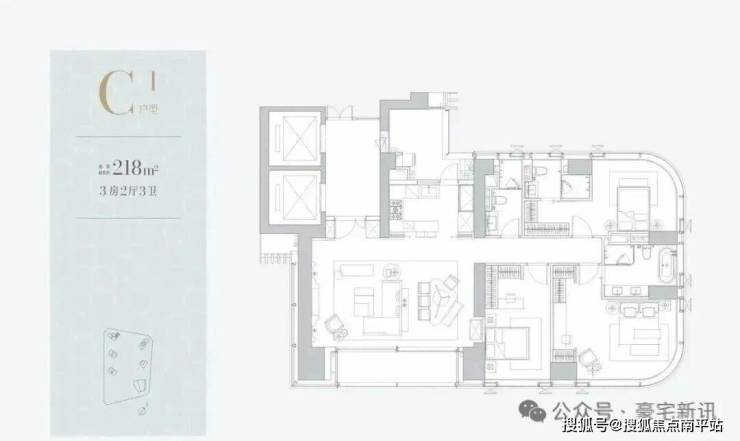 1C栋(1栋三单元)-51层 : 4梯3户 ,约 210㎡ ,为一期的入门级户型,一层三户。