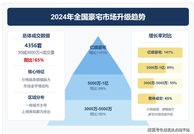 此外,2024年30个重点城市3000万元以上豪宅成交4356套,同比增长65%,其中亿元级豪宅增速达141%,形成“价格越高、增幅越大”的金字塔结构。