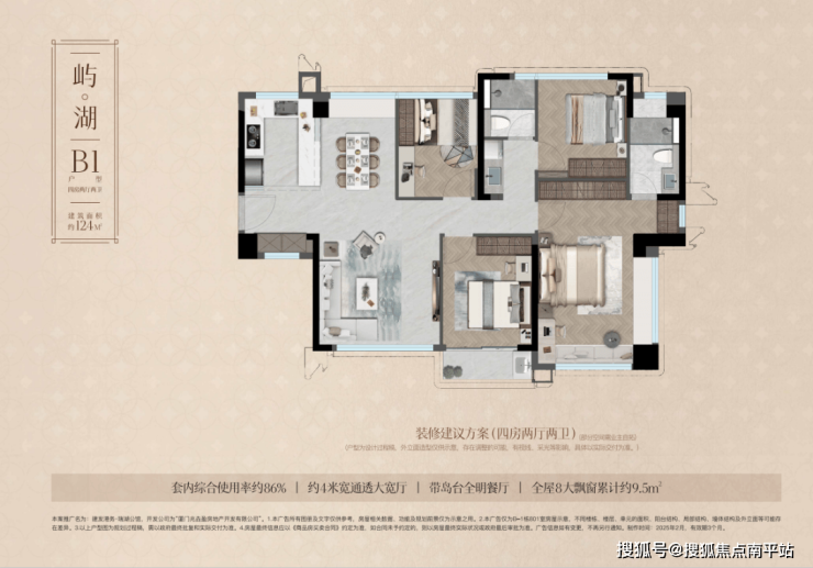 其中,124㎡户型聚焦城市精英的湖居进阶需求,以「度假感日常」为设计内核。约4米通透宽厅串联岛台全明餐厅,8大飘窗(累计约9.5㎡)延伸观景视野,让湖岸风光成为生活背景。匹配精奢社区配套,将度假质感融入归家日常,既满足城市精英对精致生活的追求,也可作为家族传承的“空中私域”,让精奢不再局限于空间,而是渗透进每一刻日常。