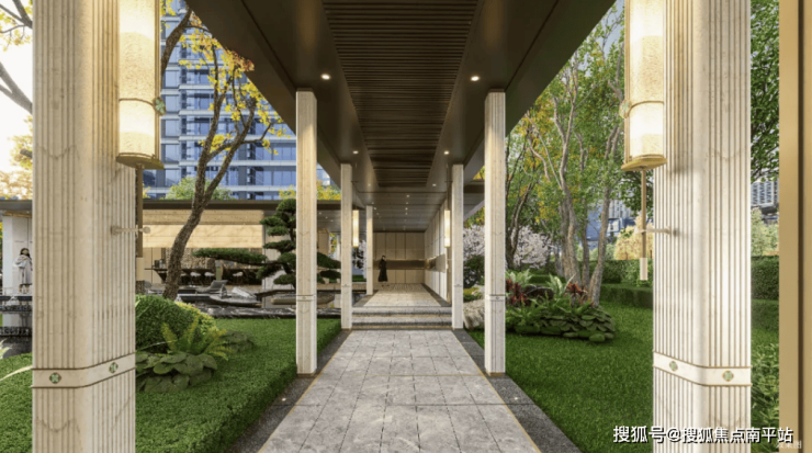 项目还通过风雨连廊与架空层体系,巧妙弥合“室内休憩”与“室外景观”的过渡断层。连廊不仅遮雨防晒、通透敞亮,架空层更延续园林调性设置休闲区,二者将散落的公共空间串联成有机整体。业主无需远行,下楼即可在自然环绕的场景中享受“家门口社交”。通过步移景异景观手法,让每一段移动都能遇见不同风景,自然提升空间体验的丰富度。