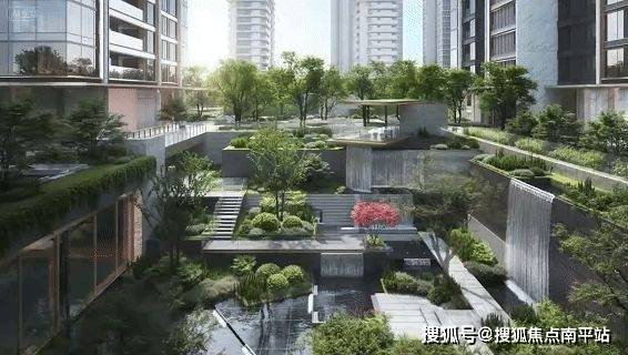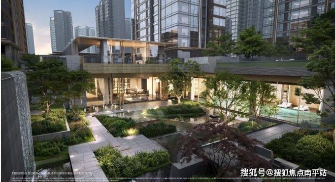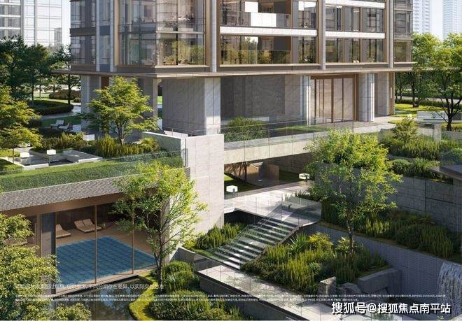 在过往长沙豪宅设计中,“下沉庭院”往往被简化为会所与园林“1+1”的组合:一个被水景、绿植包裹的盆地功能空间。而长沙瑞府四期,中心庭院不是简单的“社交功能+绿化点缀”的叠加,而是打造成集归家动线、沉浸游园、观景平台、圈层社交、艺术赏趣于一体的“垂直生态生活体系”,让自然生机向上生长、向下渗透、向生活动线蔓延,串联进社区生活的每一次呼吸与驻足,形成一座“超复合式立体生命体”。