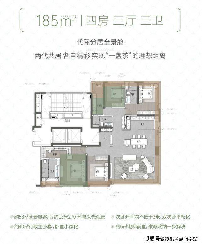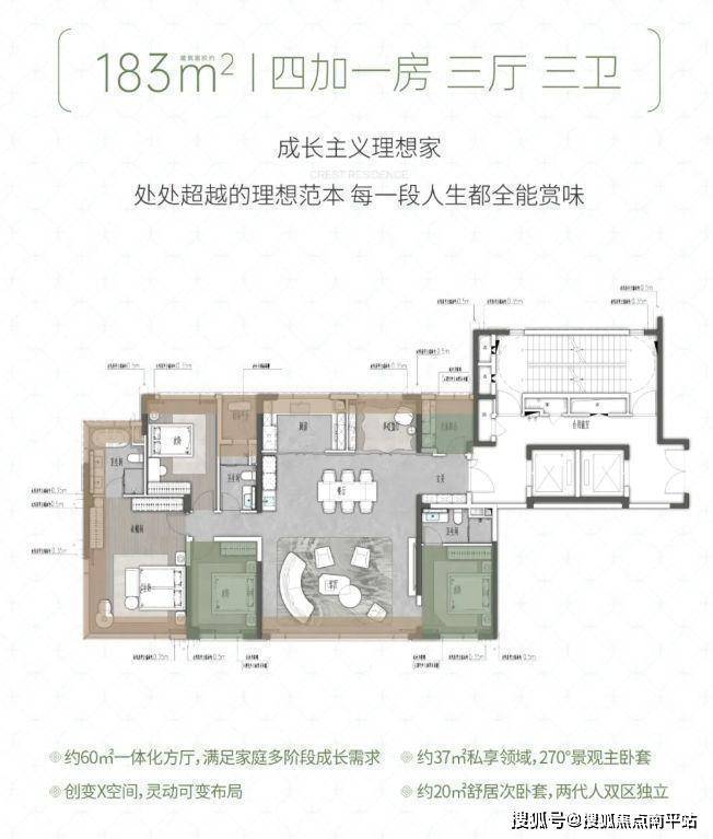 长沙瑞府四期,该楼盘主推160㎡、183㎡、185㎡、205㎡、230㎡、242㎡ 六大户型,以大平层为主,定位高端改善,得房率近100%以上。