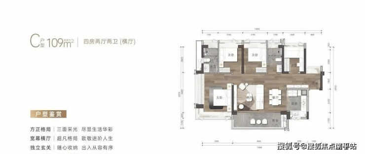 建筑面积约109㎡户型-4房2卫(横厅)