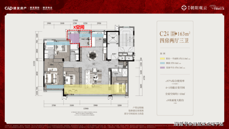 ◦ 163㎡大平层:独创的4+1房百变户型(强烈建议买家保留北向这个X空间,它会带给你别样的生活享受),超50㎡客餐厅一体化+约9米宽大阳台+约5.9米大客厅+奢阔主卧套房,餐厅开间做到了约5.2米,足以放下10人位大圆桌,尽显大宅尺度,三胎家庭、四代同堂都能从容应对。