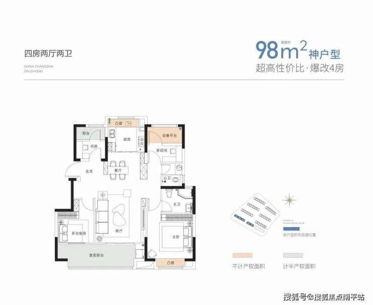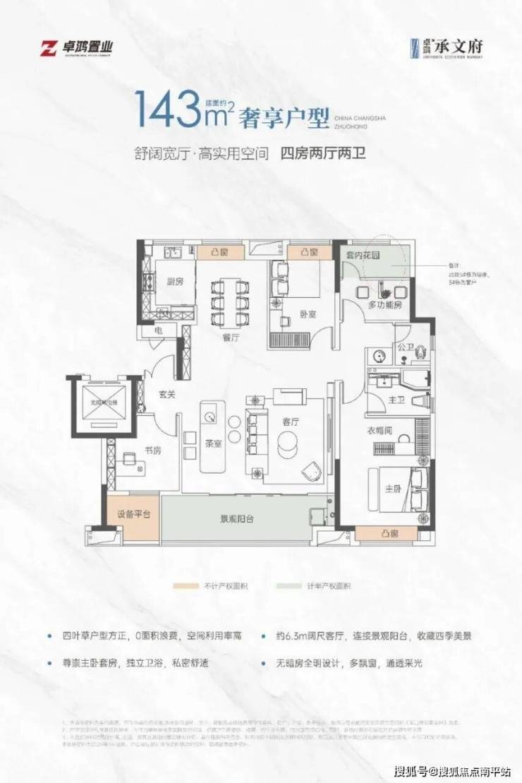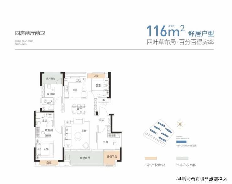 项目采用创新四叶草户型设计,一梯两户,南北通透纯板楼,多飘窗、套内阳台、套内花园设计,增加多个可落地实用空间,最大程度减少空间浪费,超100%得房率,98-116平米均为纯南北通透四房两厅两卫,115㎡尺度更佳;