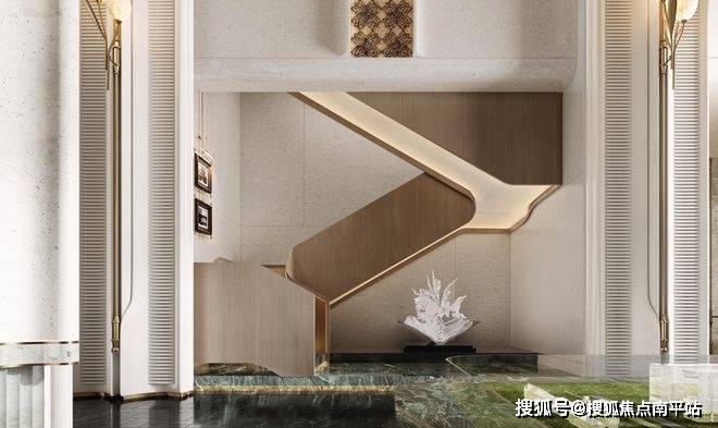第二章,“琴瑟和鸣”。则于归家大堂与艺术楼梯处奏响生活序曲。屏风与壁灯演绎品牌符号,奢石墙面呈现青绿山水画卷,花瓣吊灯融入品牌色,营造出“生活如乐章般舒展”的韵律感。钢结构楼梯以古琴丝弦为灵感,搭配灯带营造悬浮之美,呼应“步步高升”的寓意;转角处以环保再生材料打造的艺术品,更体现了品牌对可持续理念的践行。