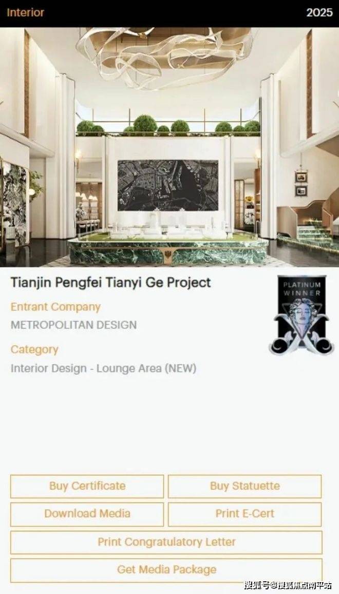近日,鹏飞集团丨地产旗下“鹏飞·天一格”项目售楼处空间设计,凭借其深度融合东方文化底蕴与现代艺术语境的创新实践,从全球数万件参赛作品中脱颖而出,荣获2025年美国MUSE设计奖最高荣誉——铂金奖(PLATINUM WINNER)。