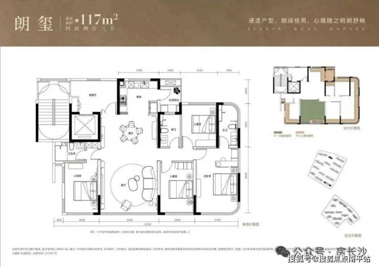 117㎡做到了4房2厅3卫,南向大面宽,同面积段少见三明卫+生活阳台,得房率约120%,套内面积约140㎡,配置拉满。
