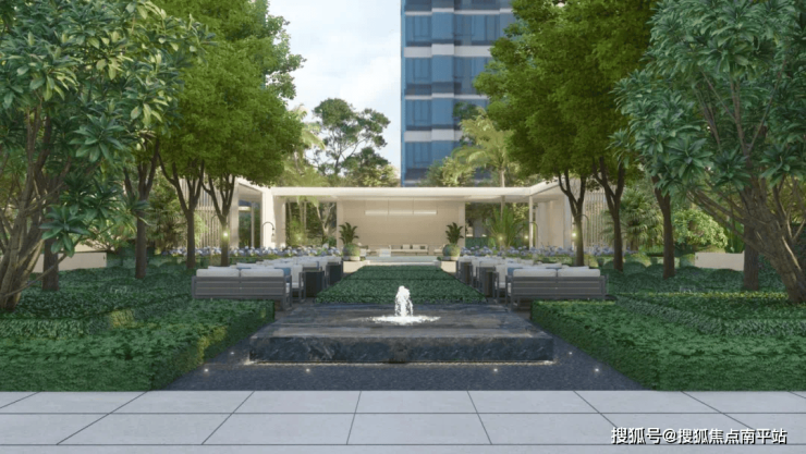 社区入口采用酒店式大堂形式,通过雕塑、迎宾水景、雨林感自然绿化等,在古典和浪漫中,形成尊贵的归家感受。