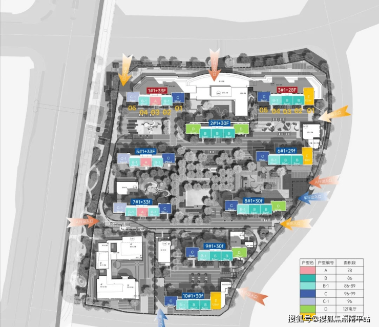 •绿化率: 36% ; •总户数:1380户;规划9栋29~34层超高层,2梯5户设计,楼间距:28~55米;车位:1426个;