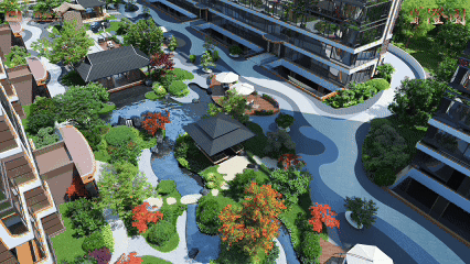 以北宋《西园雅集图》为灵感,项目打造“一轴、二心、八庭院”景观架构,将山水亭林融入8100㎡园林: