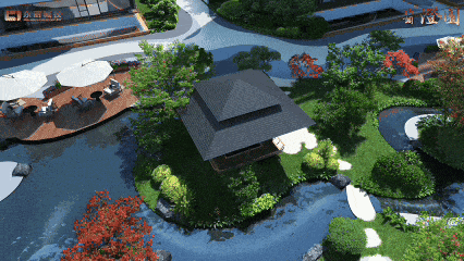 交互式场景:晨曦太极推手于云纹铺装,午后儿童戏水于叠瀑曲径,傍晚茶室观景于太湖石畔,全龄活动空间与自然共生。