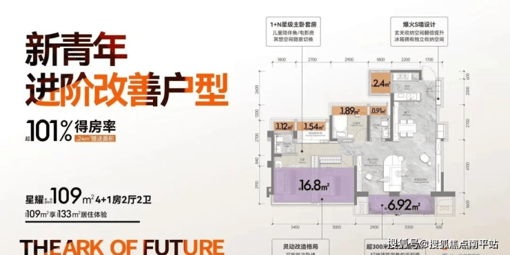 1、得房率101%,赠送了24㎡,住出133平的宽阔感。
